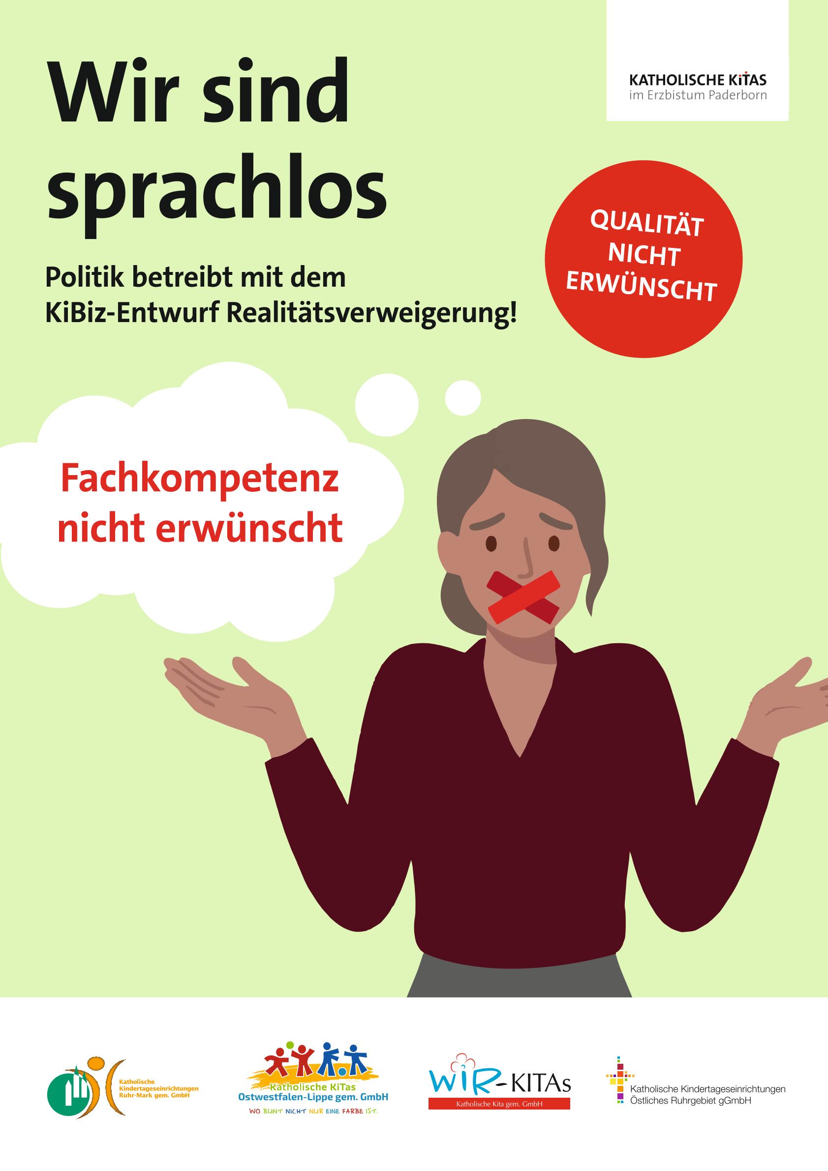 „Wir sind sprachlos – die Landesregierung betreibt mit dem KiBiz-Entwurf Realitätsverweigerung“! Das ist unser Eindruck, wenn wir auf eine Vielzahl an Themen und Fragegestellungen rund um den derzeit zur Beratung im Landtag liegenden Gesetzentwurf zum Kinderbildungsgesetz schauen. Lange Zeit waren wir immer wieder laut, wir haben zum Beispiel protestiert und Postkartenkampagnen gestartet. Nun sind wir angesichts der Inhalte des Gesetzestextes wirklich sprachlos – deshalb schweigen wir als symbolisches Zeichen.